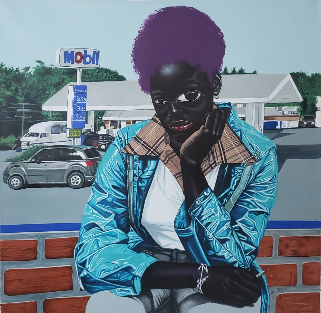 Leaning on his personal understanding of “The African Origin Of Civilisation” by Cheikh Anta Diop, Elangwe who is already known for his signature large eye representing enlightenment decided to create a unique visual aesthetic whereby, subjects with rich dark complexions stand confident against detailed backgrounds. Executed with acrylic, the richness of the figures’ dark skin aims at celebrating Blackness and, challenging the representations that objectify or dehumanize Black people. On the other hand, the skillfully detailed backgrounds, often set outdoors, represent scenes from his new environment, showing the artist’s eagerness to explore his new life whilst drawing contrasts and similarities between the United States and Cameroon.
